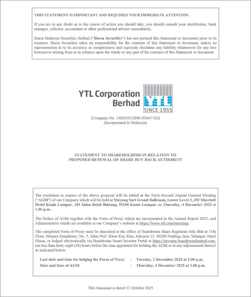 Documents to Shareholders Scroll Down Home YTLCorp Documents to Shareholders YTL Corporation Berhad Annual Report 2025 Statement to Shareholders