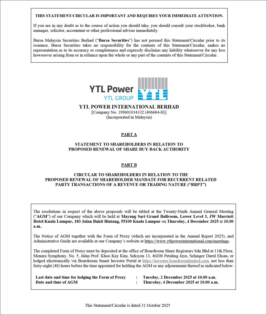 Documents to Shareholders Scroll Down Home YTLPI Documents to Shareholders YTL Power International Berhad Annual Report 2025 Statement/Circular to Shareholders